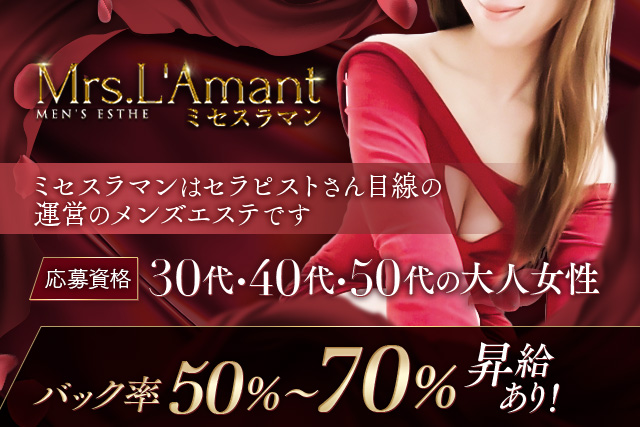 大阪・京都と事業拡大中!安心して稼げるメンエスはMrs.L’Amant(ミセスラマン)!日給5万円以上可能!安心の女性オーナーのお店です♪高待遇で貴方様をお出迎え!